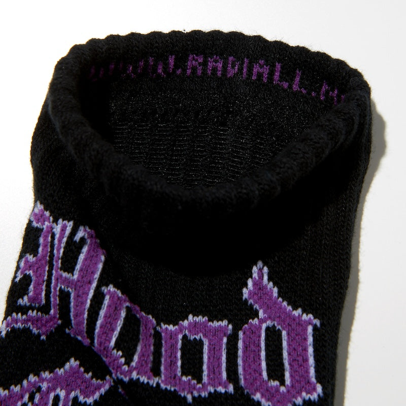 ジャガードでふくらはぎ側に「HOOD CITY」、履き口裏には「WWW.RADIALL.NET」、足裏には「NO STASH INSIDE」が入ります。